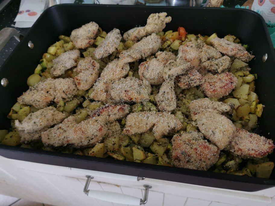 BOCADITOS DE POLLO AL HORNO CON VERDURAS, es un plato delicioso, rápido de preparar y muy sabroso. Los bocaditos se vuelven crujientes gracias a un empanado de pan rallado y especias, el pollo se cocina primero en la sartén, luego empanado y cocido al horno con las verduras. Tenía algunas verduras que usar, patatas, calabacines y pimiento, restos de recetas anteriores, y aquí está la solución, con el pollo son una maravilla. En práctica, un segundo plato con acompañamiento en una única receta. En lugar de pollo también se puede usar pavo o pechuga de pollo cortada en trozos, un plato con pocas grasas que gustará a todos