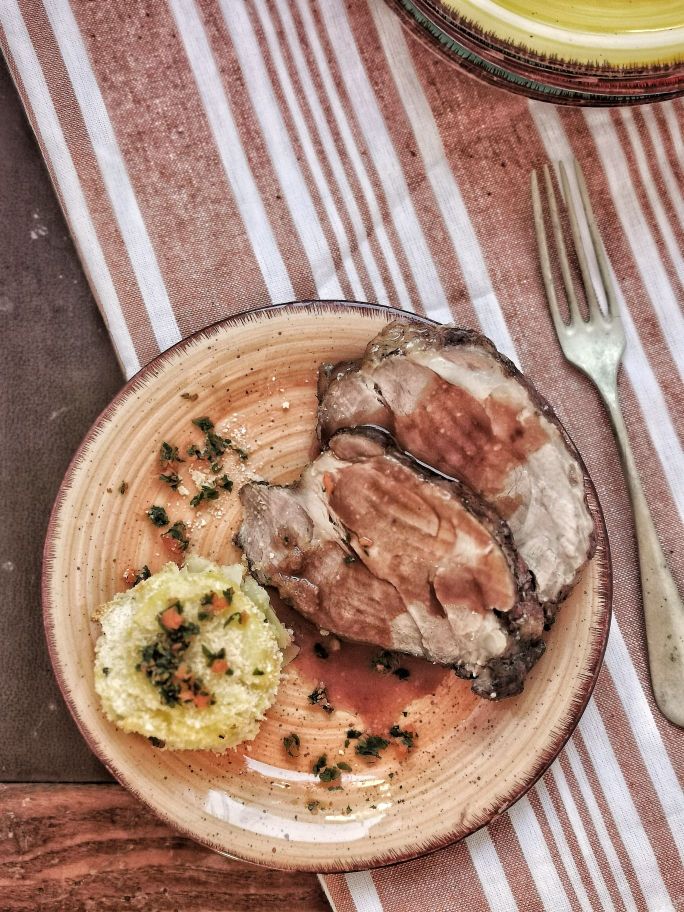Coppa asada a la piacentina con vino tinto , un segundo plato que difícilmente falta en las mesas de los piacentinos. Una receta clásica de nuestra provincia, que tiene un corte y una cocción que hacen de este plato una combinación perfecta con el también único vino, el Gotturnio. Una receta que se incluye entre los productos agroalimentarios tradicionales (PAT), se prepara con coppa de cerdo, ajo, romero y vino, en este caso he usado el tinto, pero generalmente se usa el blanco seco. El plato se acompaña con clásicas patatas asadas, pero en esta receta las he cambiado por un pastel de patatas, y buen Gotturnio superiore DOC.