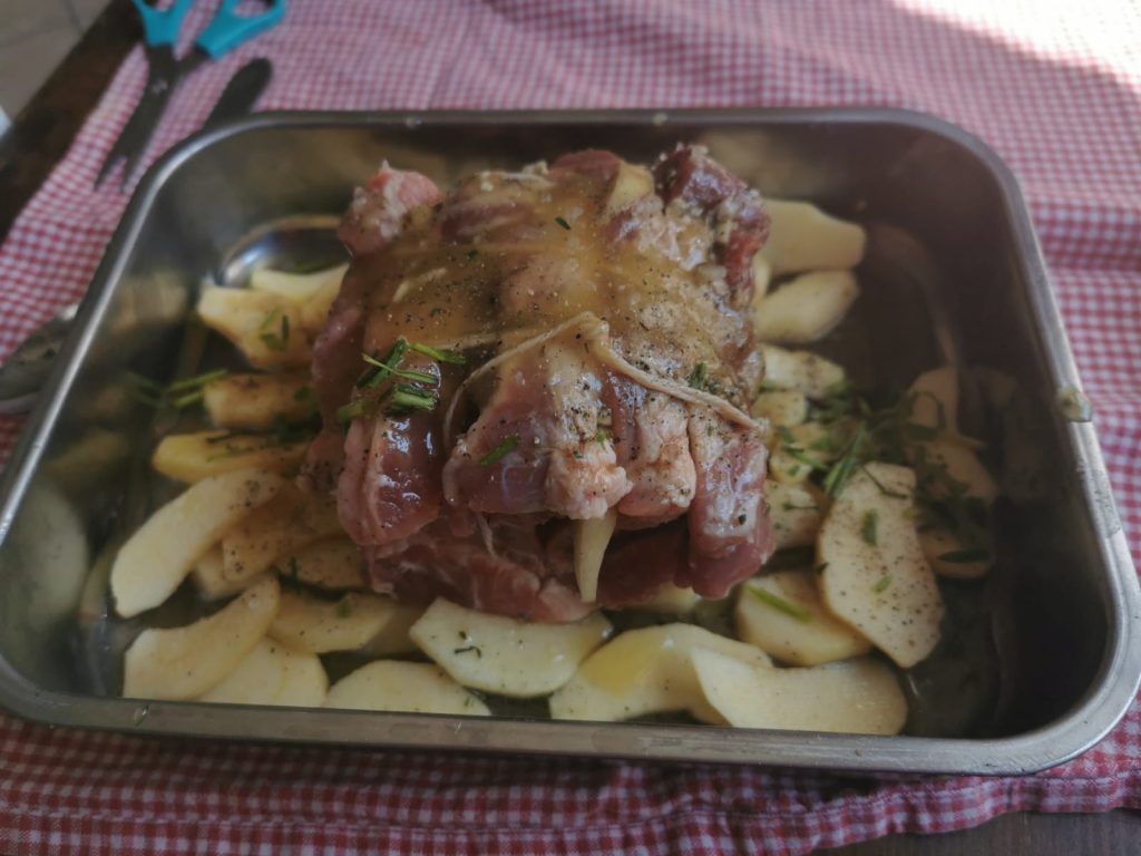• Colocamos en el fondo de la bandeja la cebolla y las rodajas de manzana sobrantes, sazonamos con sal, aceite y pimienta, colocamos encima la coppa y vertemos sobre ella dos cucharadas de miel. En este punto, ponemos en el horno precalentado a 160° y dejamos cocer durante aproximadamente 1 hora y media, controlando que el fondo no se seque