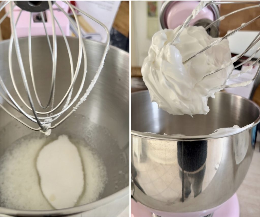 Añade el Azúcar Glas: Cuando las claras estén a punto de nieve, añade el azúcar glas avainillado tamizándolo poco a poco. Incorpora el azúcar glas de arriba hacia abajo hasta que la mezcla esté blanca, brillante y muy firme (merengue a punto de nieve). Si intentas tocarla, no debes sentir gránulos de azúcar.