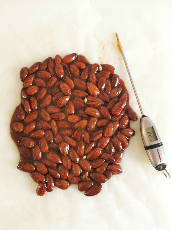 Deja que el azúcar se cocine hasta que alcance una temperatura de unos 170° (para comprar un termómetro para alimentos puedes hacer clic aquí), y empezará a oscurecerse. Mientras tanto calentamos los frutos secos en el horno, por unos minutos, y luego los vertemos en el caramelo. Removemos para mezclar bien los frutos secos con el caramelo, tardará de 2 a 5 minutos, luego apaga el fuego