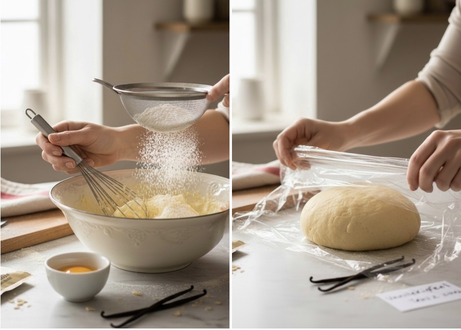 Deja reposar la masa en el frigorífico durante al menos 30-40 minutos (mejor una hora). Este paso es fundamental para que la mantequilla se solidifique y las galletas mantengan la forma durante la cocción.