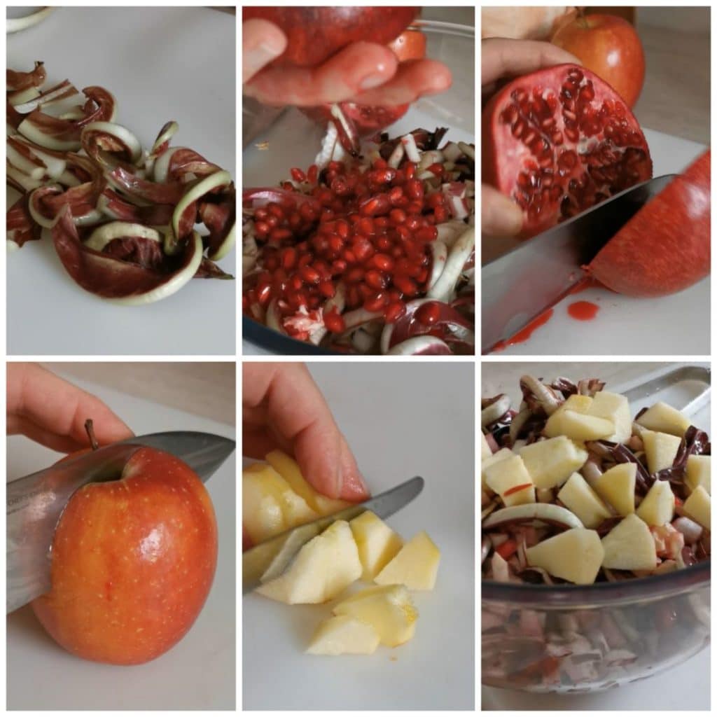 Comenzamos lavando y cortando el radicchio en trozos, dejando las hojas un poco más largas que el resto. Luego tomamos la granada, la cortamos por la mitad y sacamos las semillas. Pasamos a la manzana, la pelamos y la cortamos en trozos. En un bol, unimos el radicchio, la granada, la manzana, las nueces y reservamos.