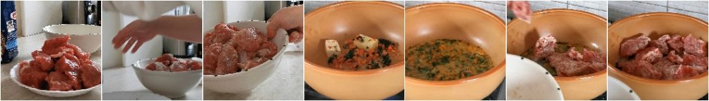 Dejar cocinar el estofado durante aproximadamente una hora y media a fuego muy bajo, recuerde mezclar la carne de vez en cuando. No debe secarse nunca, así que si ves que se seca, añade el caldo caliente. Sin exagerar, debe estar húmedo pero no demasiado líquido. Después del tiempo indicado, los trozos deben estar tiernos si se pinchan con un tenedor; si aún están duros, prolongue la cocción media hora más. Poner la sal y la pimienta