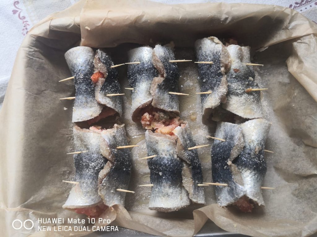 Colocar un poco de la mezcla sobre cada filete de arenque, luego enrollar el arenque sobre sí mismo para formar un rollito, fijándolo con un palillo. Colocar todos los rollitos en una bandeja forrada con papel de horno (si deseas adquirirlo haz clic aquí) y rociar al gusto con aceite de oliva virgen extra. Hornear los rollitos en horno precalentado a 180° por 15 minutos. Tus filetes de arenque están listos.