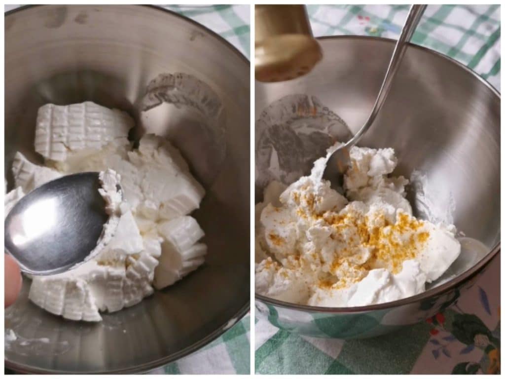 En un tazón, trabajar la ricotta con el curry hasta obtener una crema, ayudarse primero con una cuchara y luego con el batidor