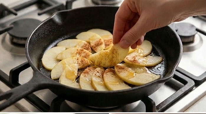 Carameliza las manzanas: Calienta una sartén pequeña antiadherente y coloca las láminas de manzana con una pizca de canela y una cucharada de agua (o un chorrito de mantequilla). Déjalas ablandar 2-3 minutos a fuego medio.