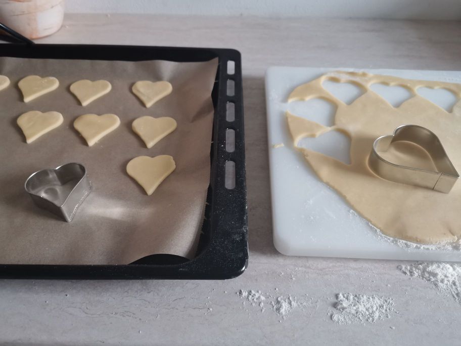 Extendemos la masa con un grosor de aproximadamente medio centímetro, con un rodillo sobre una tabla de amasado. Comenzamos a cortar las galletas con un cortador de galletas con forma de corazón. Obtendrán unas veinte galletas, en las cuales haremos un agujero en el centro con un cortador de corazón de 1 cm de diámetro, y otras veinte que dejaremos con forma de corazón sin agujero.
