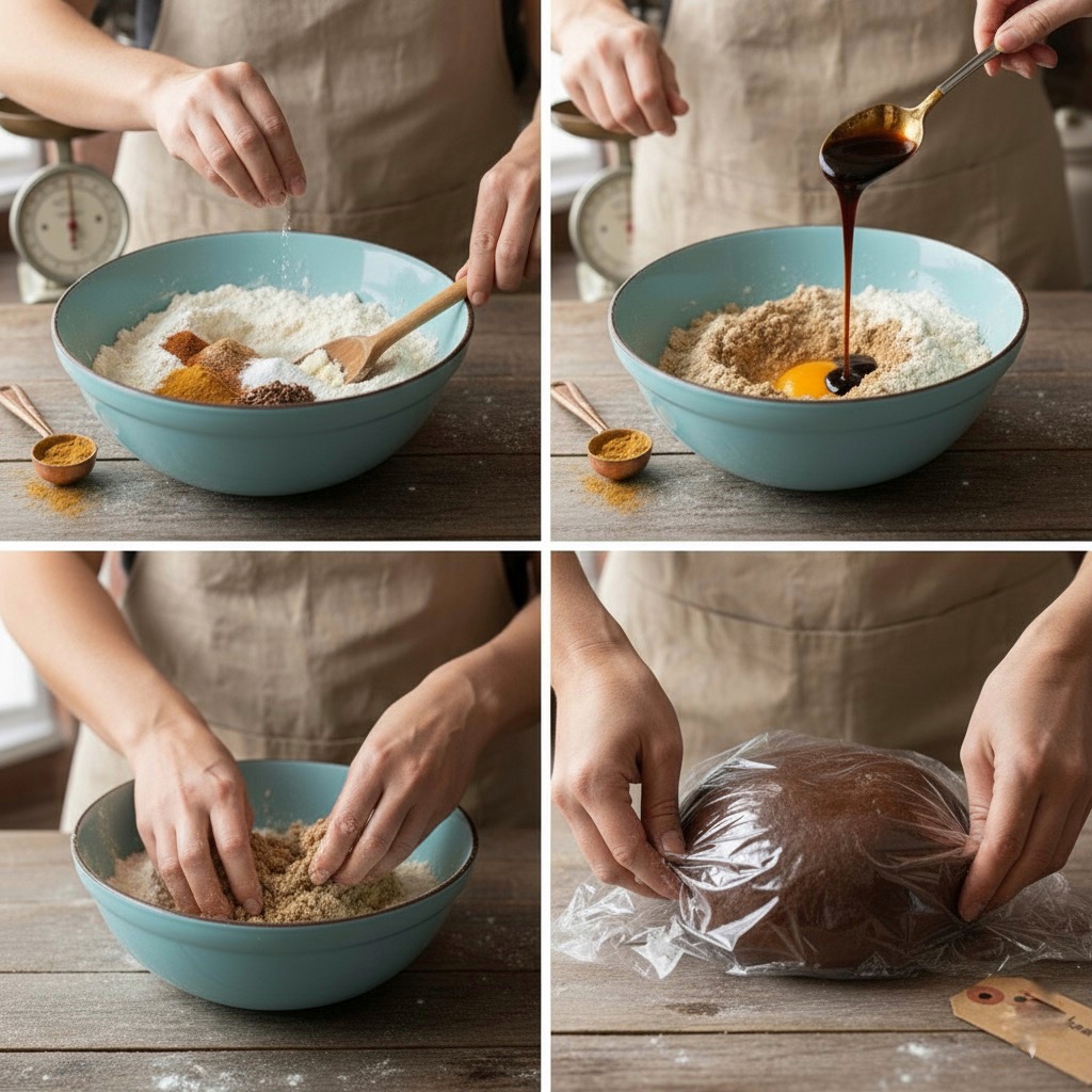 En un bol grande (o en el mezclador), mezcla la harina 00 tamizada con el azúcar glas, el bicarbonato, la sal y todas las especias (jengibre, canela, clavos de olor y nuez moscada). Añade la mantequilla fría cortada en cubos. Trabaja rápidamente con las yemas de los dedos (o con el mezclador a pulsos) hasta que obtengas una mezcla arenosa y granulosa (lo que se llama arenado).