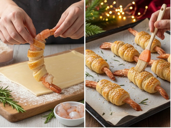 • Envolvimiento: Toma una tira de hojaldre y envuélvela en espiral alrededor de la gamba, empezando por la parte de la cabeza y bajando hacia la cola. Superpón ligeramente el hojaldre en cada vuelta para que la gamba quede bien «empaquetada». Deja fuera solo la aleta de la cola.