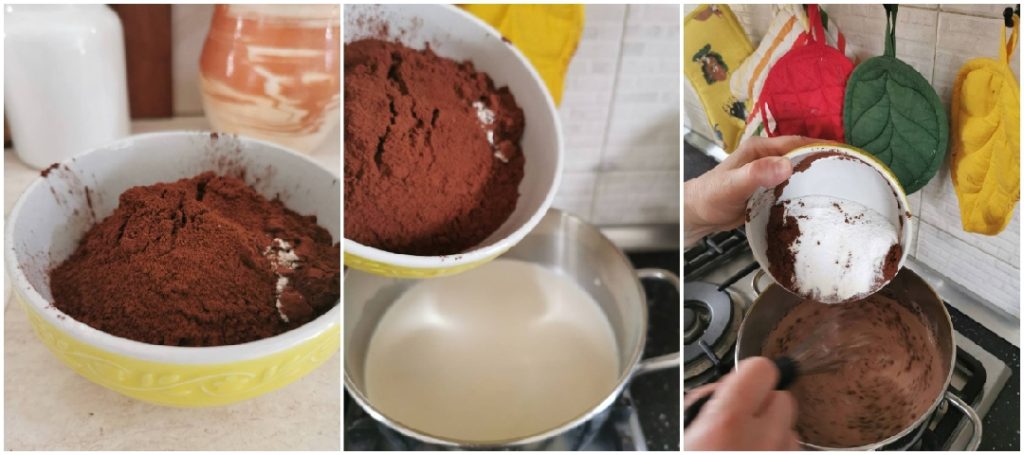 Comenzamos uniendo los polvos (leche en polvo, azúcares, harina de algarroba, cacao) en un bol, dejo a un lado un poco de azúcar. En un cazo calentamos la leche con el azúcar apartado. Cuando la leche haya alcanzado los 30° (usa un termómetro de cocina) añadimos la nata. Llegamos a 40° y añadimos los polvos, siempre mezclando con un batidor manual.