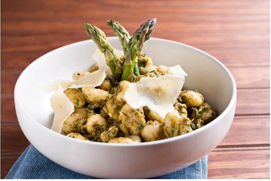 Ñoquis rellenos con crema de espárragos: una explosión de sabor cremoso con espárragos.