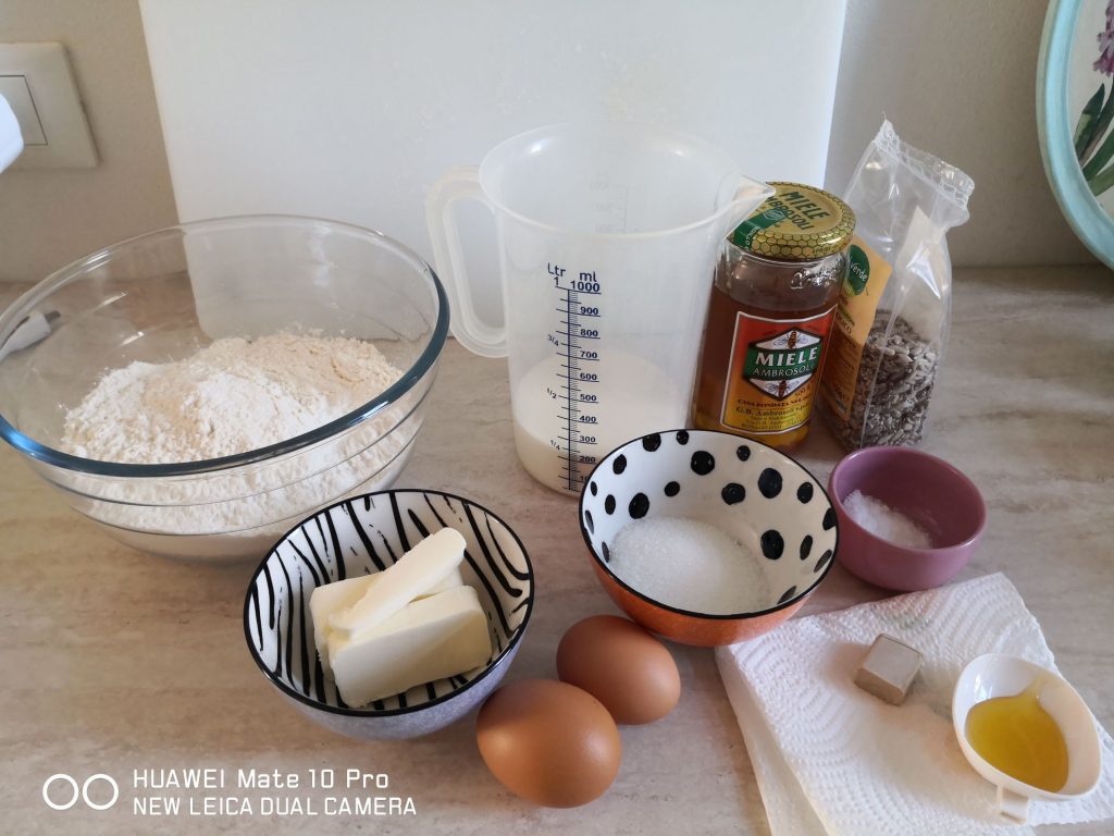 Tibiar ligeramente un poco de leche y disolver en ella la levadura de cerveza. Verter en el bol de la amasadora, equipado con gancho, la harina tamizada con la miel, el azúcar, la mezcla de leche tibia y levadura y los huevos a temperatura ambiente, uno por uno. Si se amasa a mano, utilizar un bol muy amplio.