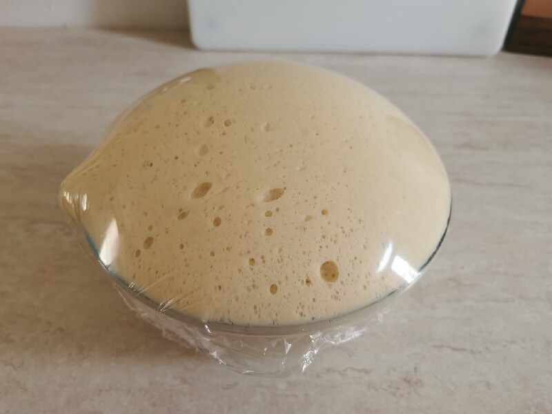 Podéis optar por meter la masa en el frigorífico durante 12h o dejarla triplicar cubierta con film transparente. Pasadas las 12h en el frigorífico o la fase de fermentación, retomar la masa y esperar a que llegue a temperatura ambiente