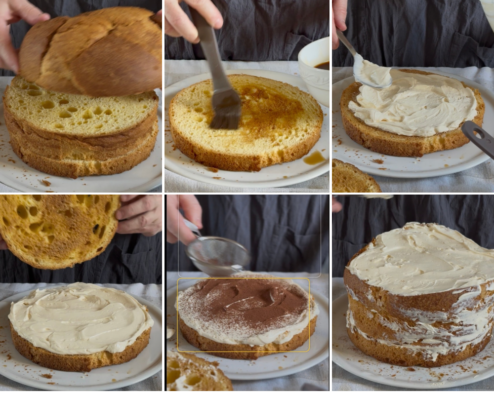 Unta una capa generosa de crema de caramelo. Espolvorea ligeramente la crema con cacao amargo en polvo. Procede igual, para los otros discos.