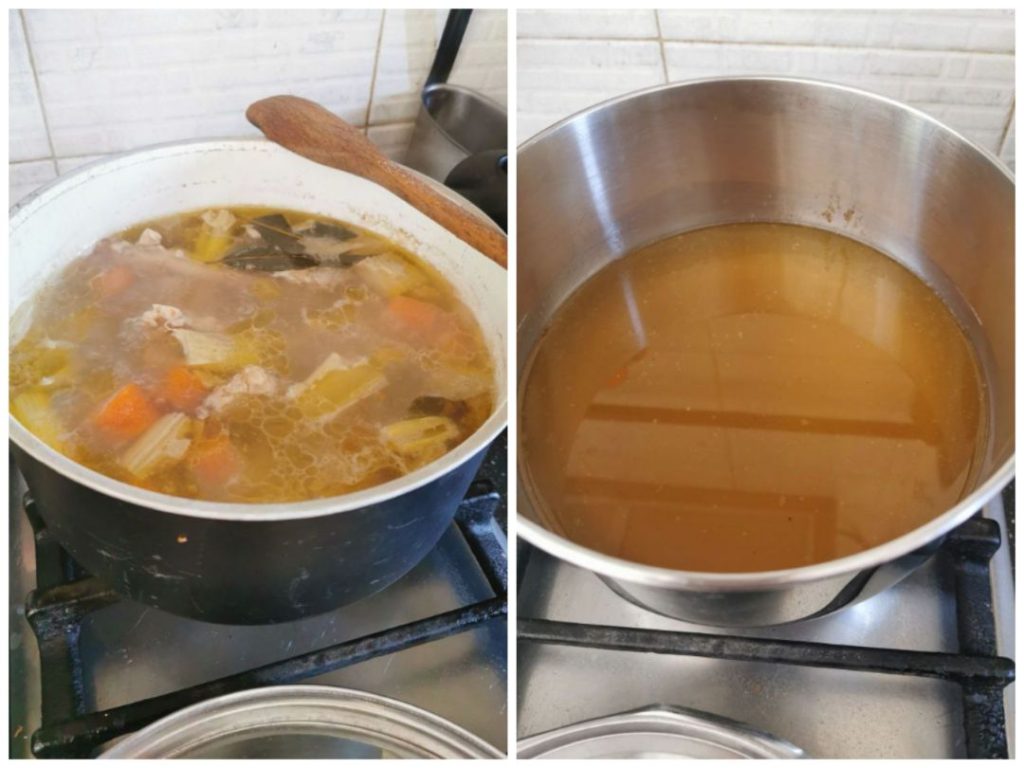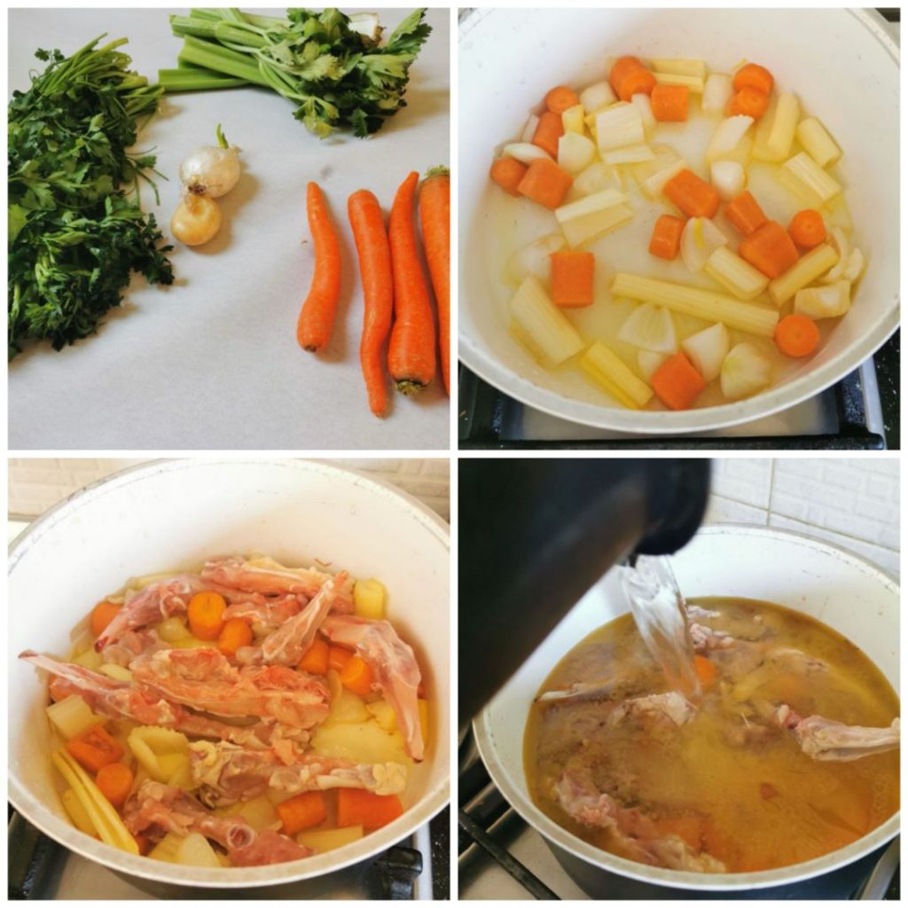 Mientras tanto, sofríe en una sartén media rama de apio, media zanahoria y media cebolla con una cucharada de aceite, añade los huesos, dorándolos bien. Luego cubre todo con agua y deja hervir a fuego medio durante media hora