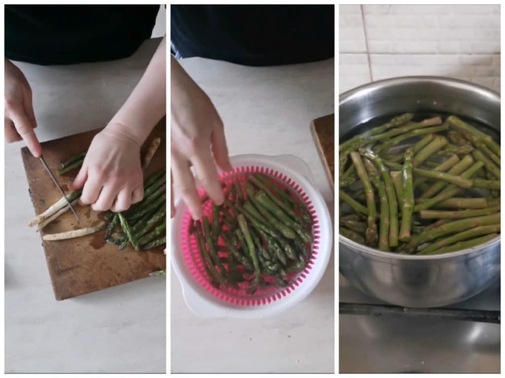 Eliminar la parte más leñosa de los espárragos y lavarlos, luego hervirlos en abundante agua salada por muy pocos minutos. Escurrirlos y dejarlos templar.