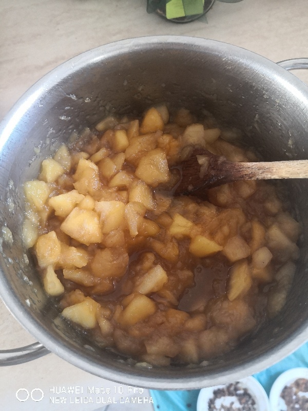 Pela las manzanas y córtalas en cubos. Cuécelas a fuego bajo con el azúcar, la cáscara y el jugo de medio limón durante unos 25 minutos. Elimina la cáscara del limón y deja enfriar.