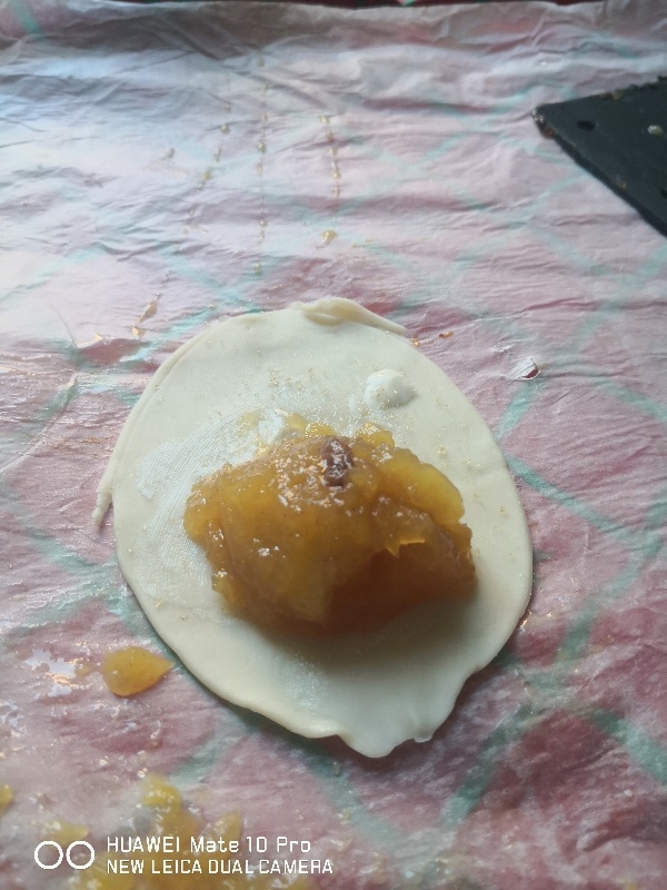Recorta en el hojaldre unos 15 discos de unos 8 cm con el corta pastas, luego extiéndelos con el rodillo para alargarlos hasta obtener una forma ovalada. Coloca sobre cada óvalo la mezcla de manzanas y las pasas, moja los bordes con el huevo batido, dobla la masa y sella bien a lo largo de los bordes.