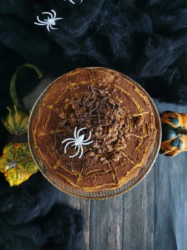 Con la crema restante cubrimos la superficie del pastel, espolvoreamos con cacao amargo y con un palillo dibujamos una especie de telaraña. Encima desmenuzé restos de pastel obtenidos al nivelar el contorno
