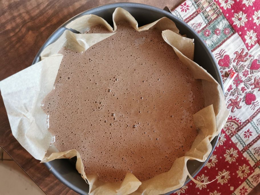 Comenzamos preparando el pastel de chocolate. En un bol grande, poned los huevos, las dos harinas, el cacao, la levadura y el azúcar. Accionad la batidora eléctrica y mezclad todos los ingredientes; tomará 3/4 minutos. Verted la mezcla en un molde de 22 cm forrado con papel de horno. Dejad reposar en la nevera durante unos 30 minutos, y luego hornead a 170° durante 25 minutos