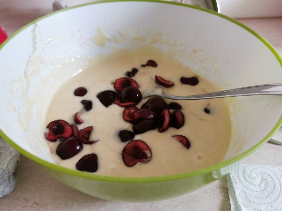 Añadimos poco a poco la harina tamizada, previamente mezclada con la levadura, alternándola con las cucharadas de yogur a temperatura ambiente. Mezclar a velocidad media, la masa debe ser densa y aterciopelada. Una vez lista, incorporamos parte de las cerezas lavadas y deshuesadas, mezclando suavemente con una cuchara