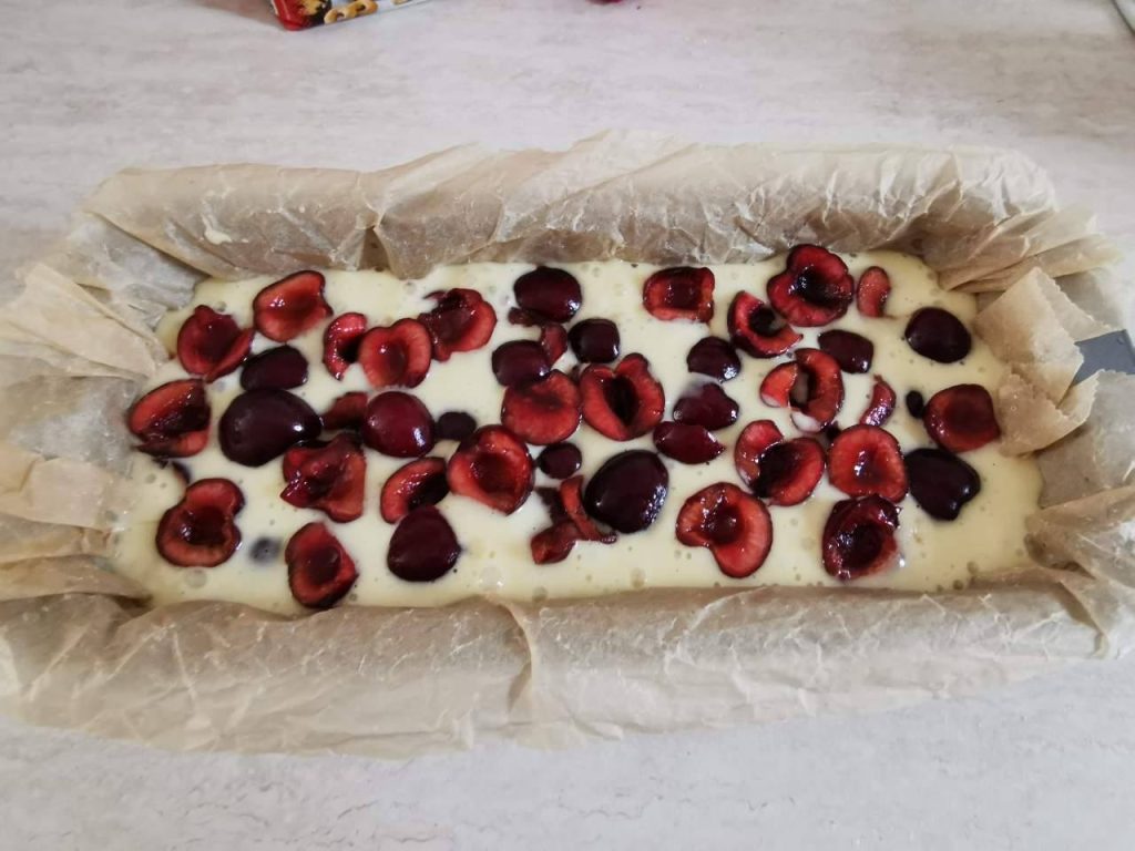 Tomamos el molde para plumcake, lo forramos con papel de horno, e introducimos la masa. Colocamos encima las cerezas restantes. Horneamos a 185° en la parte medio alta del horno estático, cocinamos durante unos 40 minutos