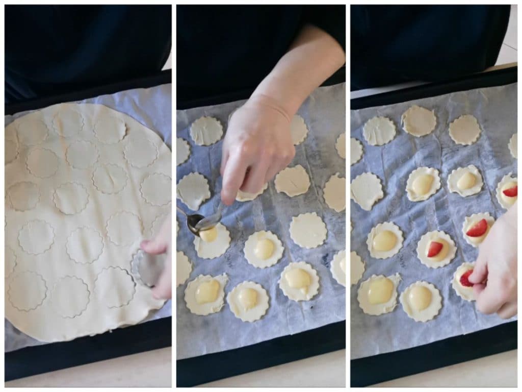 Extender el hojaldre en una bandeja cubierta con papel de horno y cortar discos en número par, de unos 4 cm de diámetro. En la mitad de estos discos, colocar en el centro de cada uno un poco de zabaione y un trozo de fresa