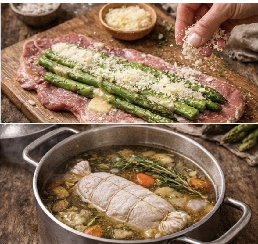 Tomamos la carne y la abrimos en libro; usando un cuchillo liso y afilado, con un ablandador golpeamos la carne y la sazonamos con un puñado de pimienta. Colocamos los tallos de los espárragos a lo largo de toda la pieza de carne y los espolvoreamos con parmigiano. Enrollamos y atamos la ternera con varias vueltas de hilo de cocina, comenzando por el centro; envuélvelo en una gasa y ciérralo en forma de caramelo. Sumergimos el rollo en el caldo hirviendo y lo hervimos durante aproximadamente 35 minutos.