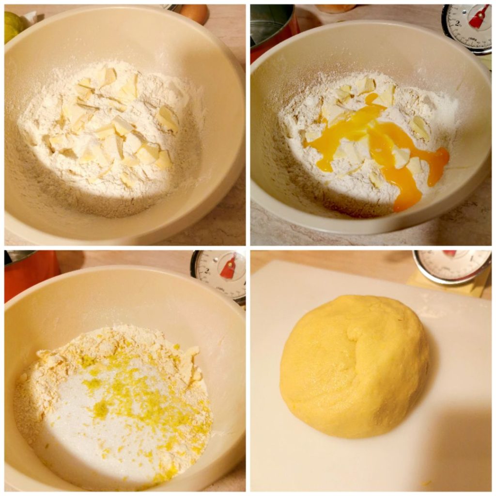 Sobre una superficie, disponemos en forma de volcán la harina tamizada con la levadura. Naturalmente, también podéis usar la amasadora si la tenéis. Añadimos la mantequilla en trozos, el azúcar, las yemas, la piel rallada del limón y una pizca de sal. Comenzamos a trabajar los ingredientes y, poco a poco, añadimos el passito.
