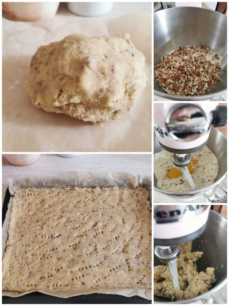 Movemos todo en la batidora, añadimos la mantequilla en trozos, las yemas y la grappa. Con el gancho plano, trabajamos la masa solo el tiempo necesario para amalgamarla, para evitar que se vuelva elástica. La masa obtenida será irregular, de ahí el efecto «desmenuzado». Extendemos la masa en un molde de 30×22, forrado con papel de horno, presionándolo bien con las manos, obteniendo un grosor de unos 3 cm. Pinchamos la superficie con un tenedor