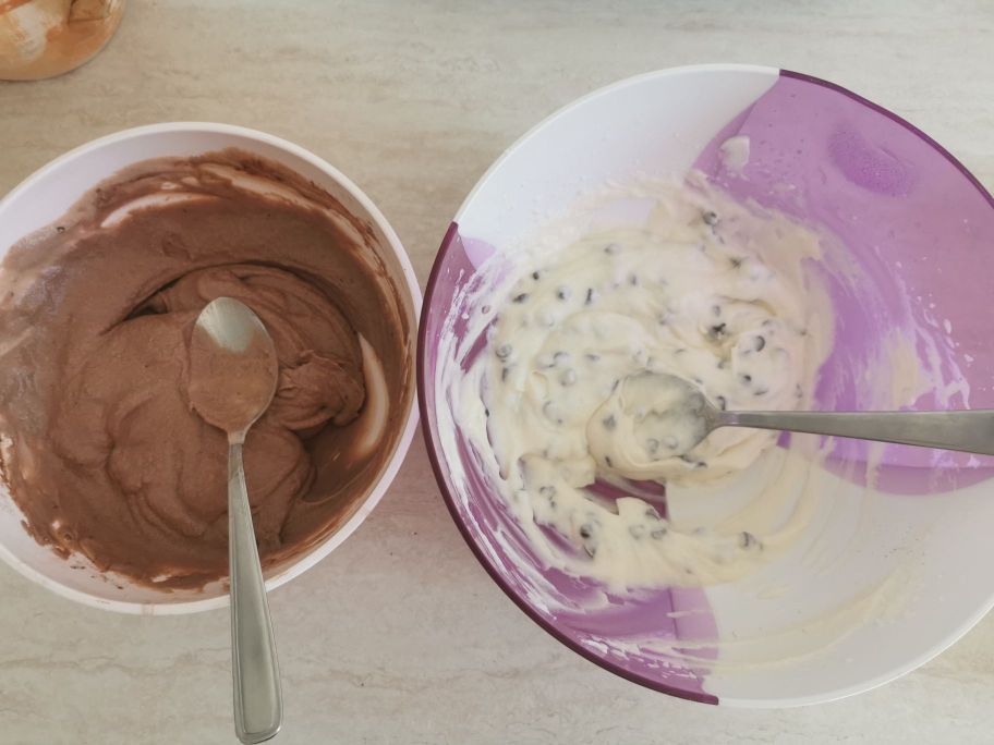 Dividid la mezcla en dos boles. En la crema clara añadid las gotas de chocolate, en la otra el cacao tamizado, mezclando siempre de abajo hacia arriba.