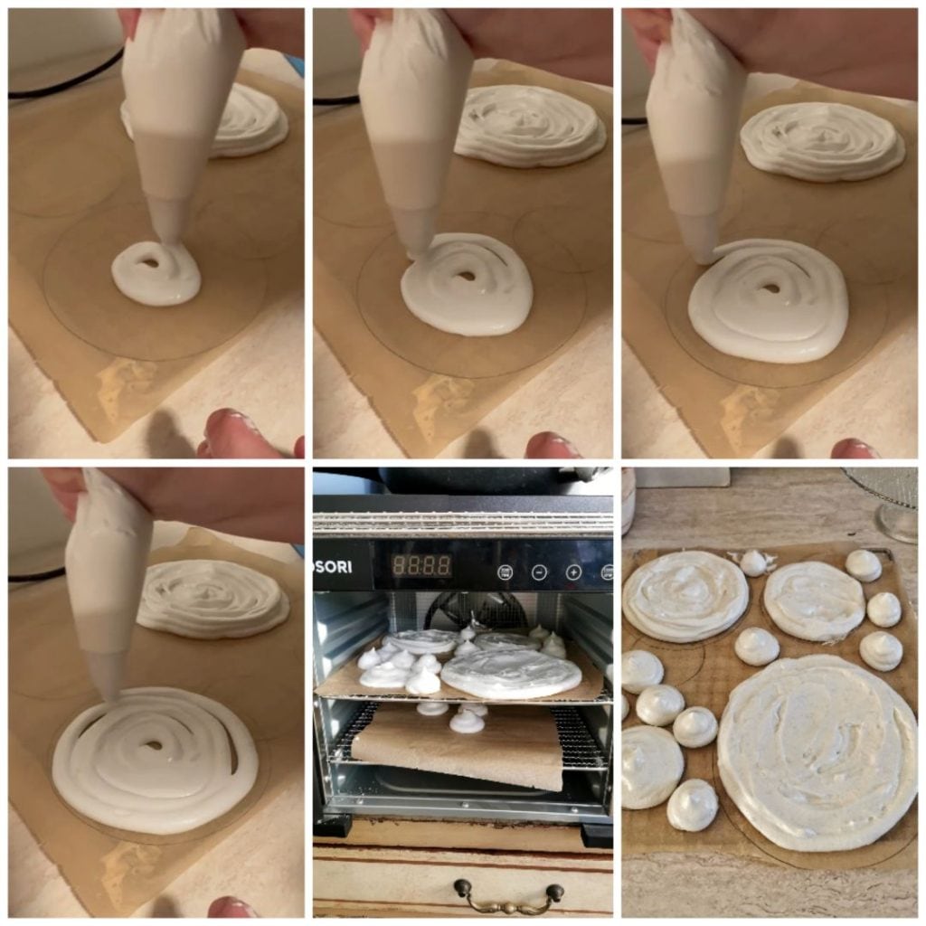 Volteamos el papel, y rellenamos los círculos que hemos dibujado con el merengue preparado. Ponemos la mezcla en una manga pastelera, con una boquilla lisa y grande de aproximadamente 1,5 cm, y comenzando desde el centro del círculo, trazamos tiras hasta cubrirlo completamente. Hacemos 2 capas de merengue por vuelta, la base debe tener al menos 2 cm de grosor. Suaviza la superficie con una espátula, procede así para todos los círculos. Pon en horno estático a 100°C durante 20 minutos, luego baja a 90°C durante aproximadamente 1h y 15 minutos. Después inserta en la puerta del horno una cuchara de madera para dejar una abertura, y cocina durante otra hora. Luego apaga. Si tienes el deshidratador puedes usarlo, ajusta a 60°C durante 10 horas
