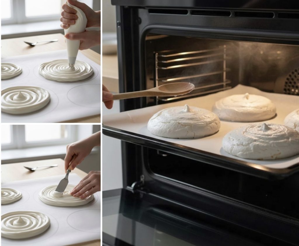 Volteamos el papel, y rellenamos los círculos que hemos dibujado con el merengue preparado. Ponemos la mezcla en una manga pastelera, con una boquilla lisa y grande de aproximadamente 1,5 cm, y comenzando desde el centro del círculo, trazamos tiras hasta cubrirlo por completo. Hacemos 2 capas de merengue por giro, la base debe tener al menos 2 cm de espesor. Alisamos la superficie con una espátula, procedemos así para todos los círculos. Ponemos en horno estático a 100° por 20 minutos, luego bajamos a 90° por aproximadamente 1h y 15 minutos. Después colocamos una cuchara de madera en la puerta del horno para dejar una rendija, y cocinamos por otra hora. Luego apagamos. Si en cambio tienes el deshidratador puedes usar eso, ajusta a 60° por 10 horas