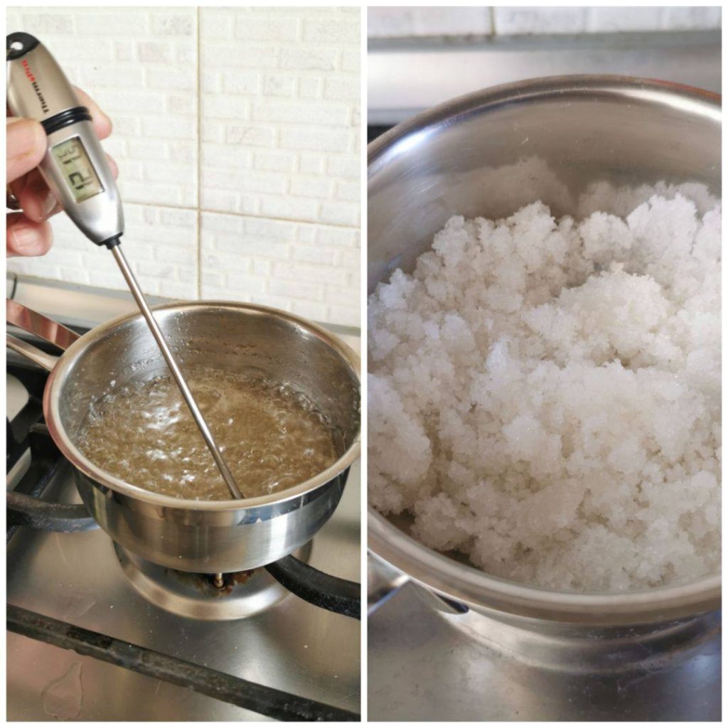 Empezamos separando las yemas de las claras. Pon las yemas en un bol o batidora, donde luego vas a montar todo. Disuelve el azúcar en el agua, girando con una cucharilla. Pon el azúcar al fuego, hasta que se convierta en un jarabe líquido, claro, o alcance la temperatura de 121° (usa un termómetro de cocina).