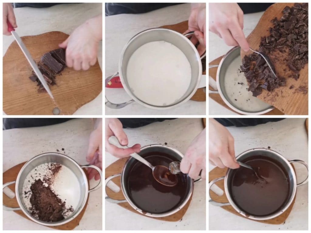 Preparamos el relleno: Troceamos el chocolate de manera gruesa, lo ponemos en un bol. Calentamos la nata en un cazo, que esté caliente. Luego la añadimos al chocolate y mezclamos hasta que se derrita. Añadimos el sirope de arce, mezclamos hasta integrar todo