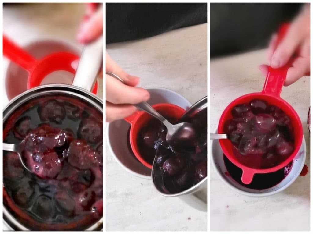 Mientras tanto preparamos una salsa de cerezas. En un cazo ponemos 350g de cerezas lavadas y deshuesadas, añadimos 4 cucharadas de azúcar, y el zumo de medio limón. Cocinamos por unos 15 minutos a fuego medio, las cerezas no deben deshacerse, después de eso filtramos para quitar un poco de jugo