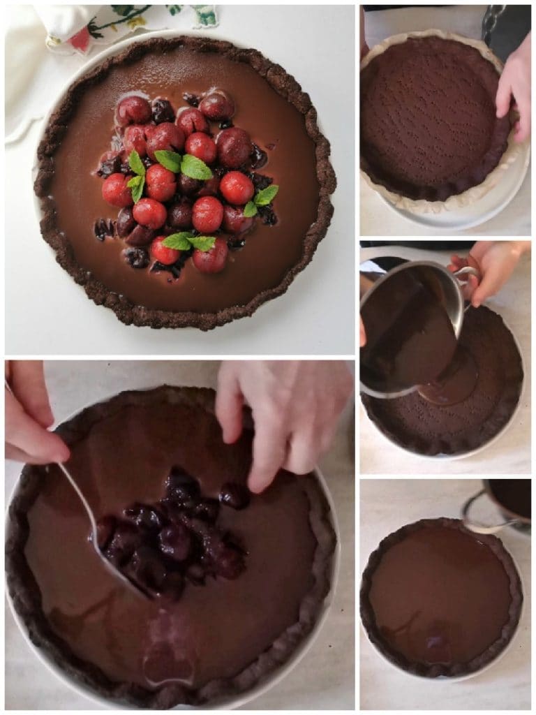 Tarta de cacao con chocolate y cerezas: una combinación de sabores irresistible una tarta deliciosa, con un relleno cremoso de ganache de chocolate y cerezas, envuelta en una base de masa quebrada de cacao.