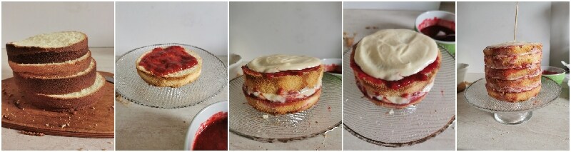Añadimos sobre la crema una cantidad generosa de compota de fresas. Añadimos el segundo disco, empapamos comenzando desde el exterior, rellenamos con crema y así sucesivamente, hasta que se acaben los ingredientes. El último disco solo se empapa con el almíbar.
