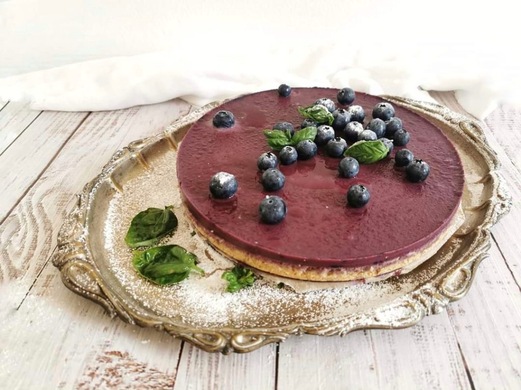 Una variante de la clásica tarta de queso, en este caso hecha con una base de galletas secas, un relleno compuesto de nata, arándanos y hojas de albahaca.