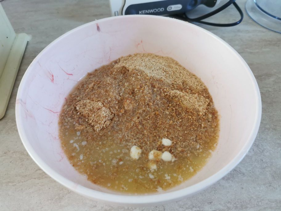 Tritura las galletas en polvo, añade la mantequilla previamente derretida y mezcla bien
