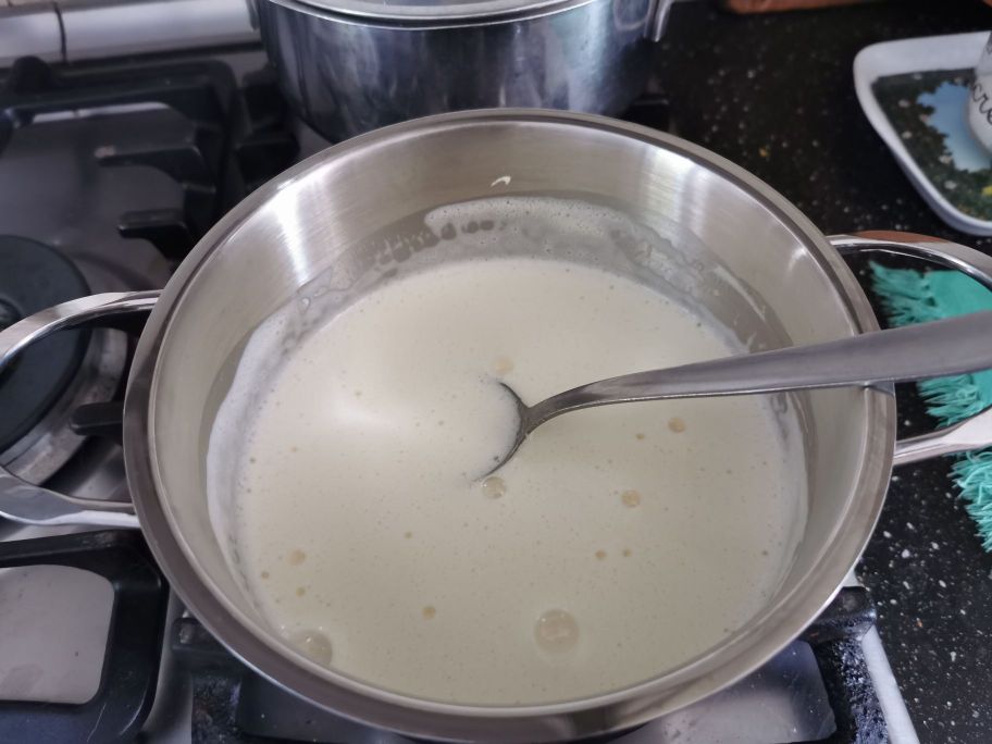 Retirar del fuego y añadir la gelatina bien escurrida. Remover y añadir gradualmente el chocolate blanco. Mezclar bien y dejar enfriar a temperatura ambiente durante unos 30 minutos