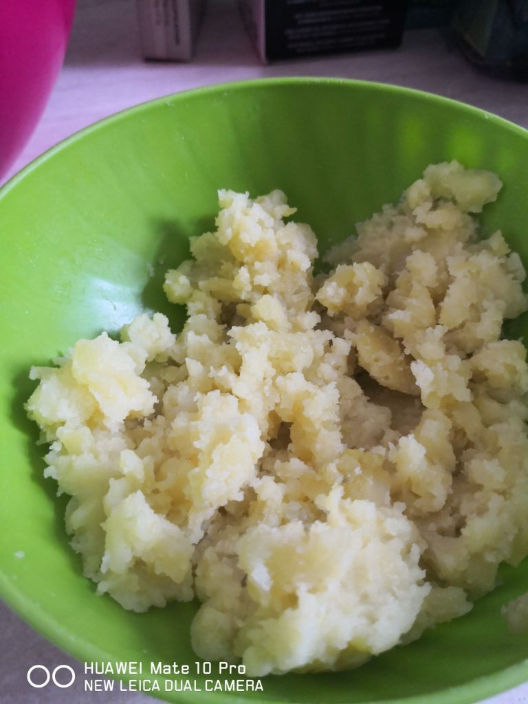 Cocemos las patatas con piel en una olla con agua hirviendo y un poquito de sal. Una vez listas, las pelamos y las pasamos por el prensapatatas. Tomamos el brie y lo cortamos en trozos