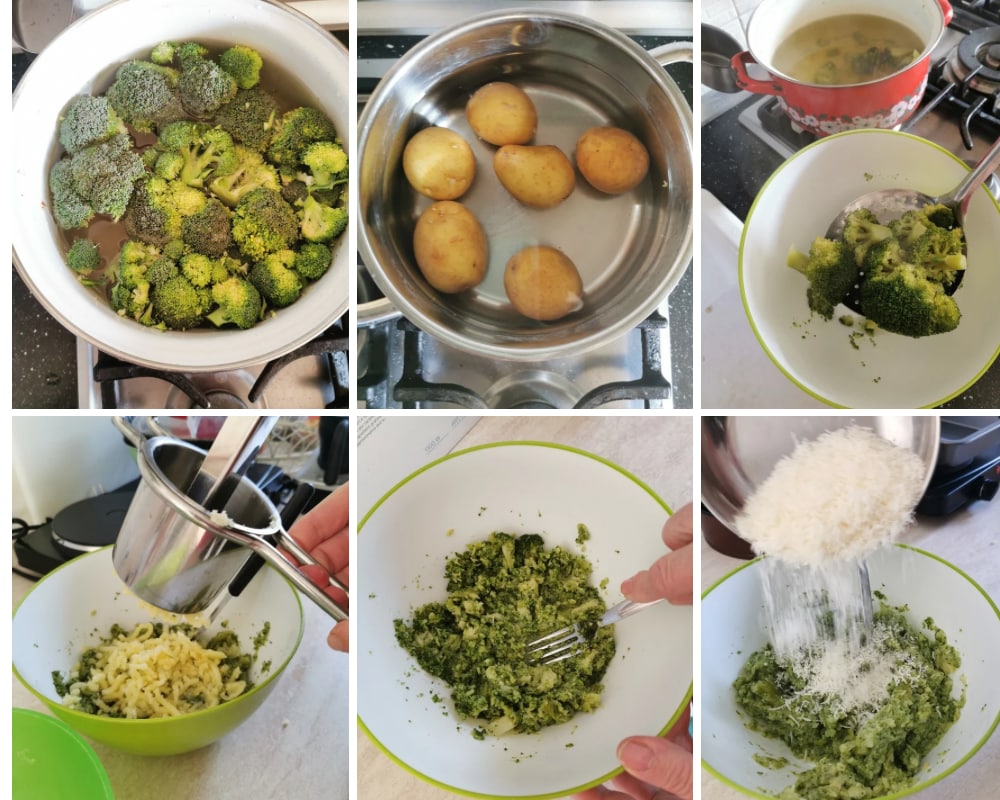 Empezamos limpiando el brócoli y cortándolo en ramitos, luego lo escaldamos en agua durante unos minutos. Mientras tanto, cocemos las patatas en otra cacerola. Una vez cocido, colocamos el brócoli en un bol, añadimos las patatas que habremos machacado con un prensapatatas, el queso, una cucharada de pan rallado y mezclamos bien todo hasta formar una mezcla homogénea.