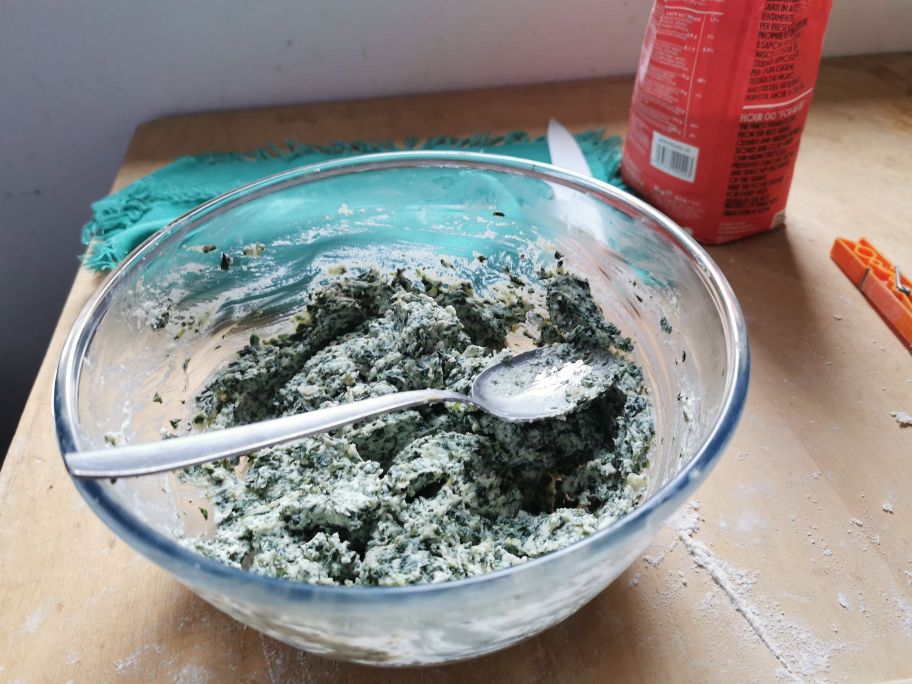 Cocina las espinacas, escúrrelas, exprímelas, pícalas con un cuchillo. En un bol, mezcla ricotta, huevo, queso, espinacas, nuez moscada y sal. Forma una mezcla homogénea