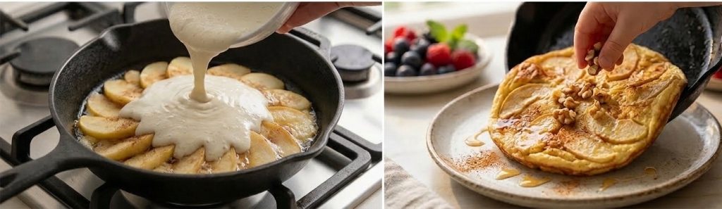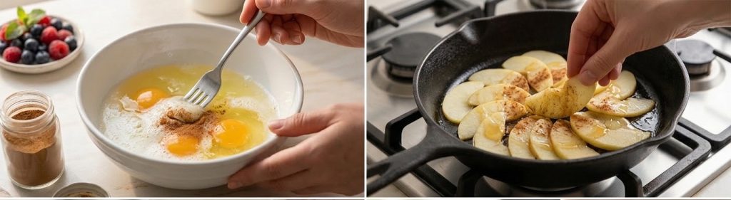 Hornea en sartén: Vierte las claras directamente sobre las manzanas en la sartén. Cubre con una tapa y cocina a fuego bajo durante unos 4-5 minutos. El vapor ayudará a que la tortilla suba.