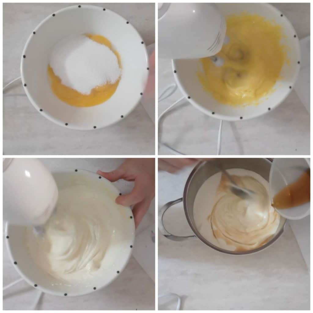 Transfieran el zabaione a un recipiente a baño maría y cuezan durante unos 10 minutos, mezclen con los batidores de mano, hasta que esté muy inflado y firme. Escurran la gelatina, exprímanla y únanla al zabaione, mezclando delicadamente