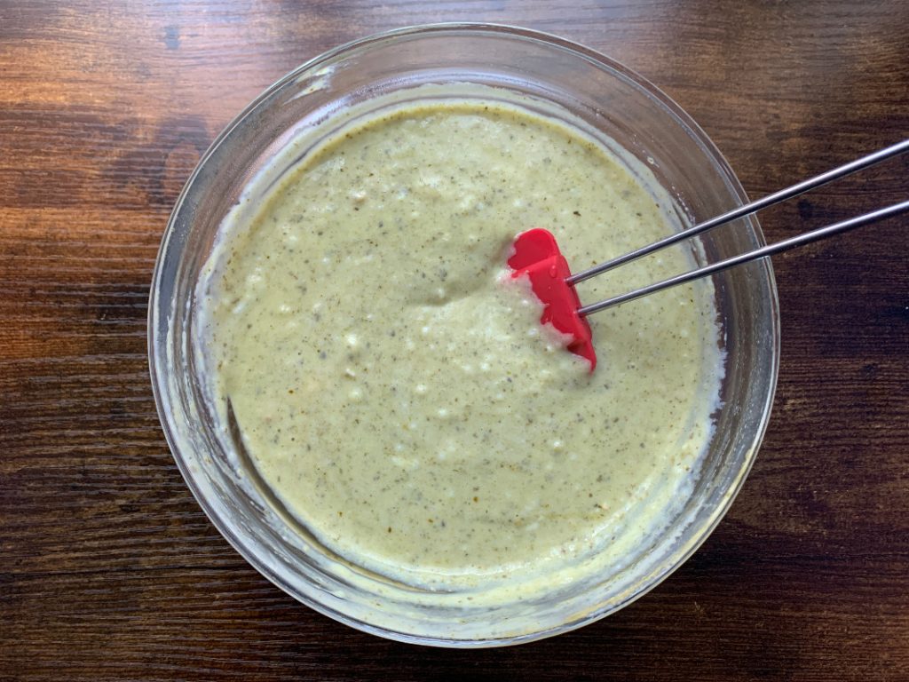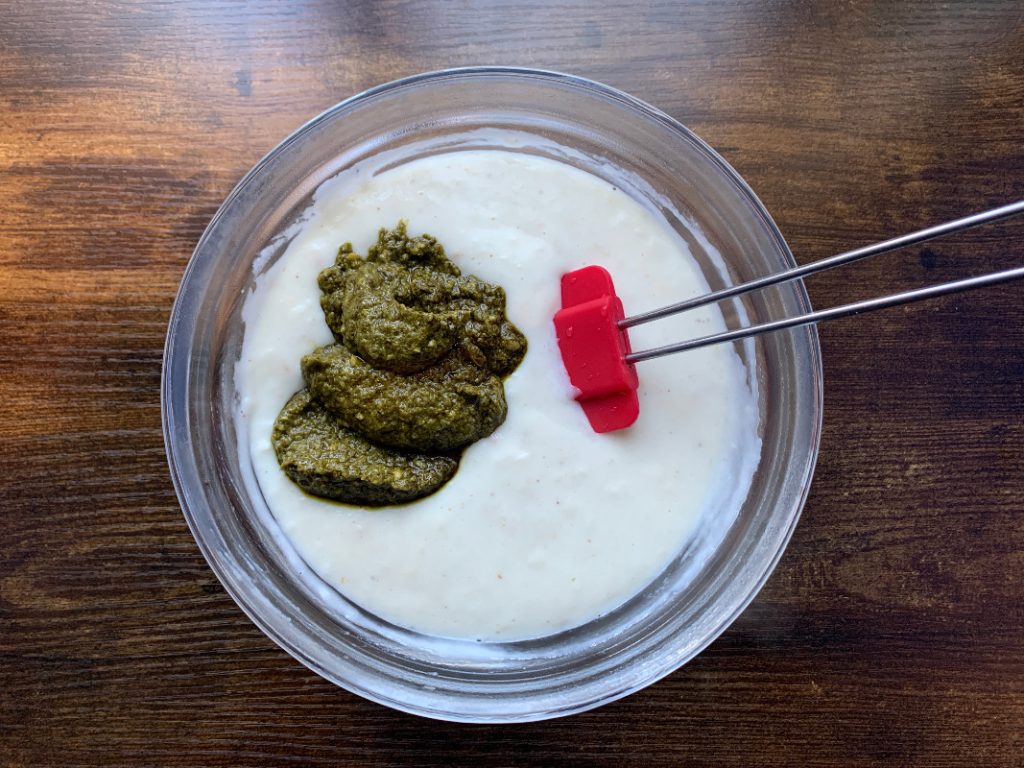 Pon la bechamel en un bol y déjala templar, añade la leche y remueve bien, luego añade el pesto (si prefieres un sabor más intenso puedes poner 2 o 3 cucharadas más).