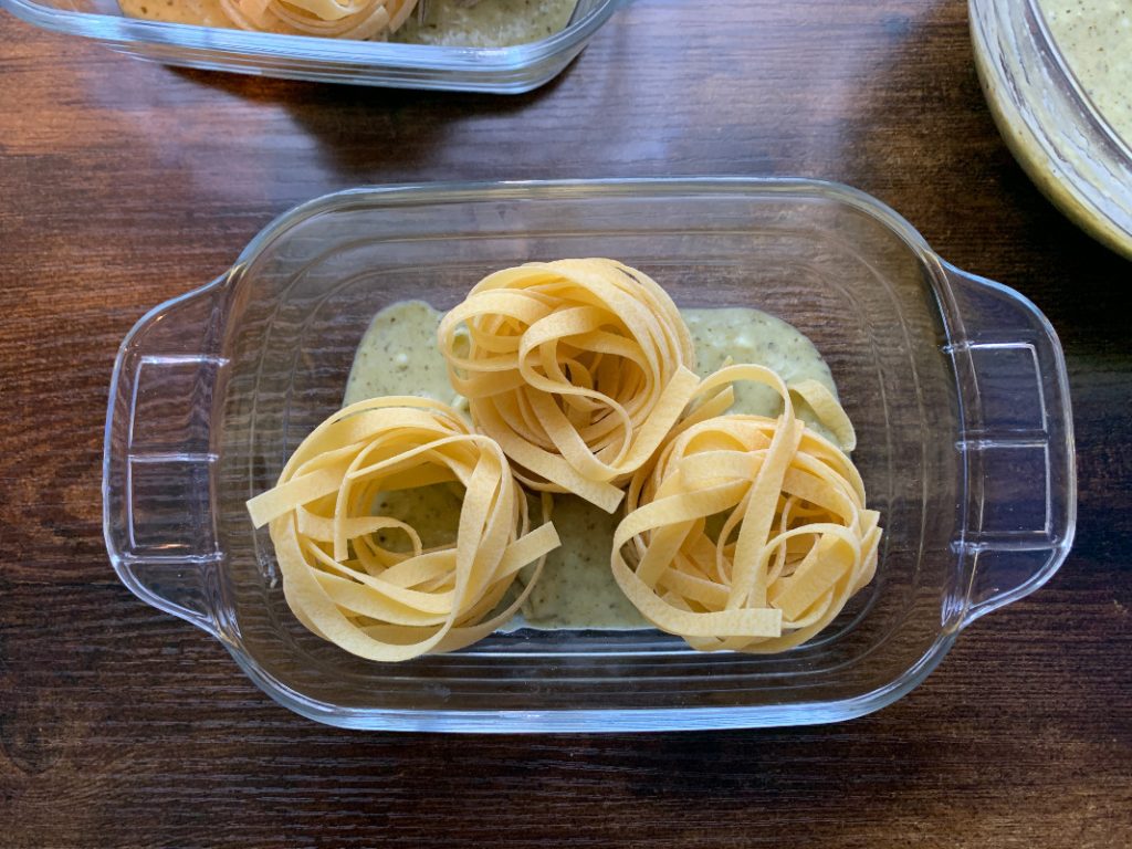 Los nidos de tallarines al pesto, un primer plato muy particular ya que la pasta se cocina en el horno y no se hierve previamente.