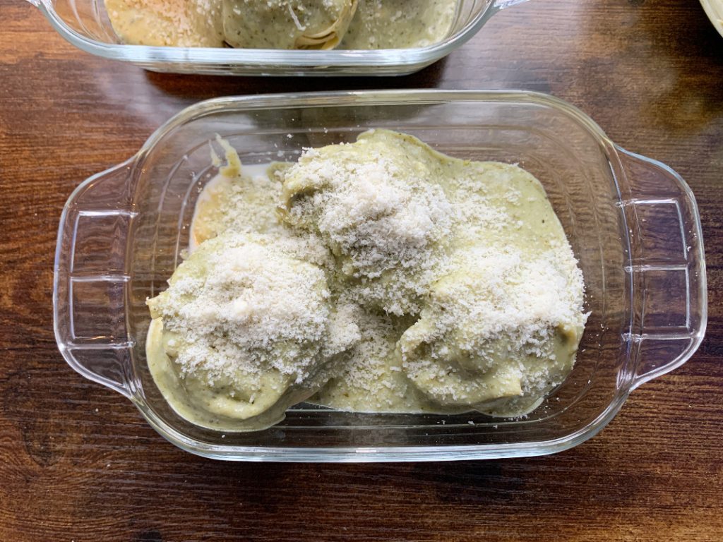 Cubre los tallarines con abundante crema de bechamel y pesto y luego haz una capa abundante de queso parmesano rallado.